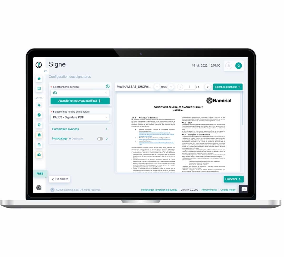 Les principales fonctionnalités de Namirial Sign sont disponibles gratuitement. Si vous souhaitez essayer la version avancée, passez au plan Premium quand vous le souhaitez.